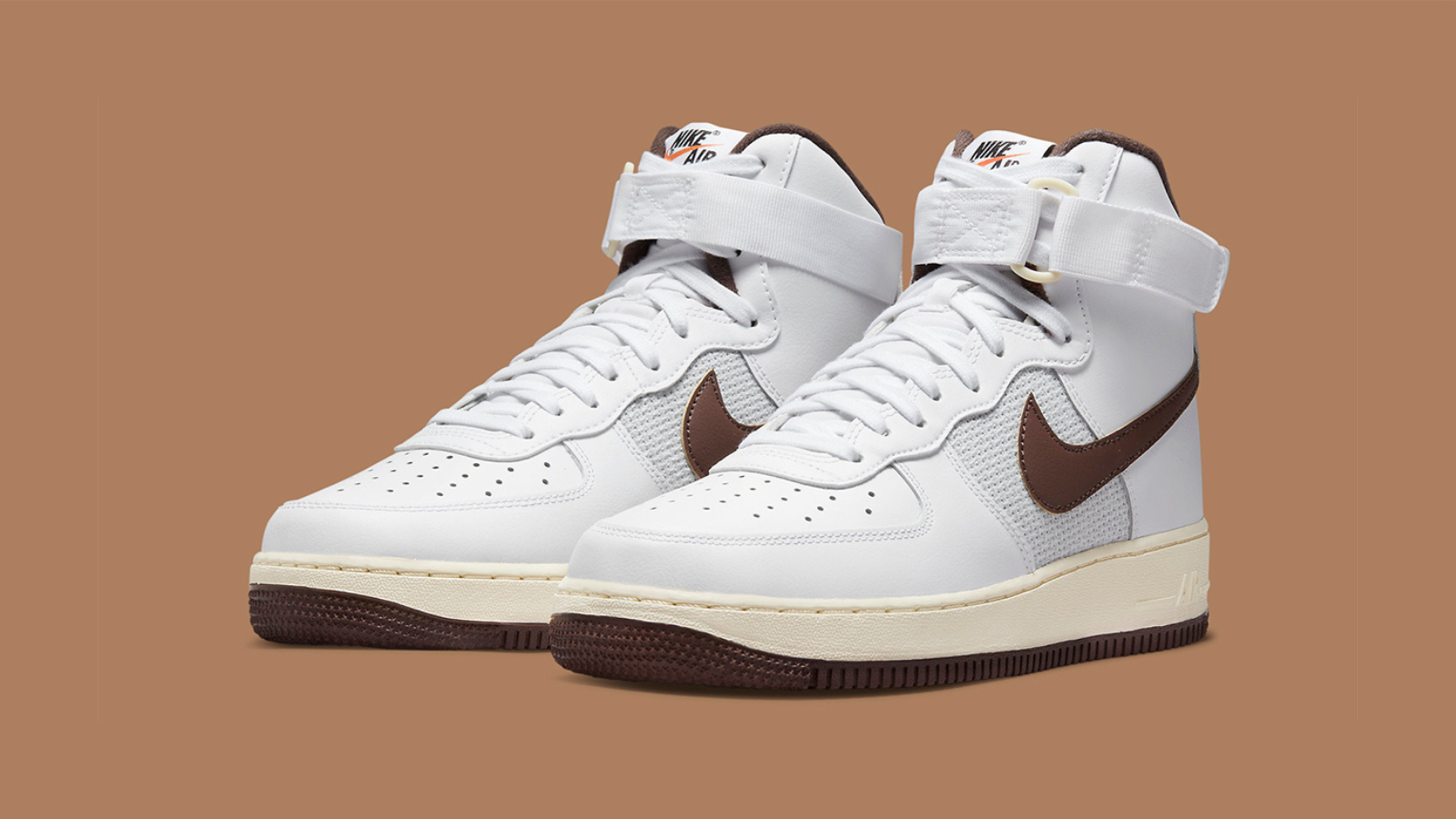 Everyone's go-to sneaker has recieved a makeover. In vintage styling, the Nike Air Force 1 High features a two-tone style reminiscent of its earliest runs. White leather predominantly coats the sneaker, while woven mid-foot panels provide a textured edge. With contrasting chocolate brown swooshes, collar lining, branding and traction, the sneaker is classically stylish.