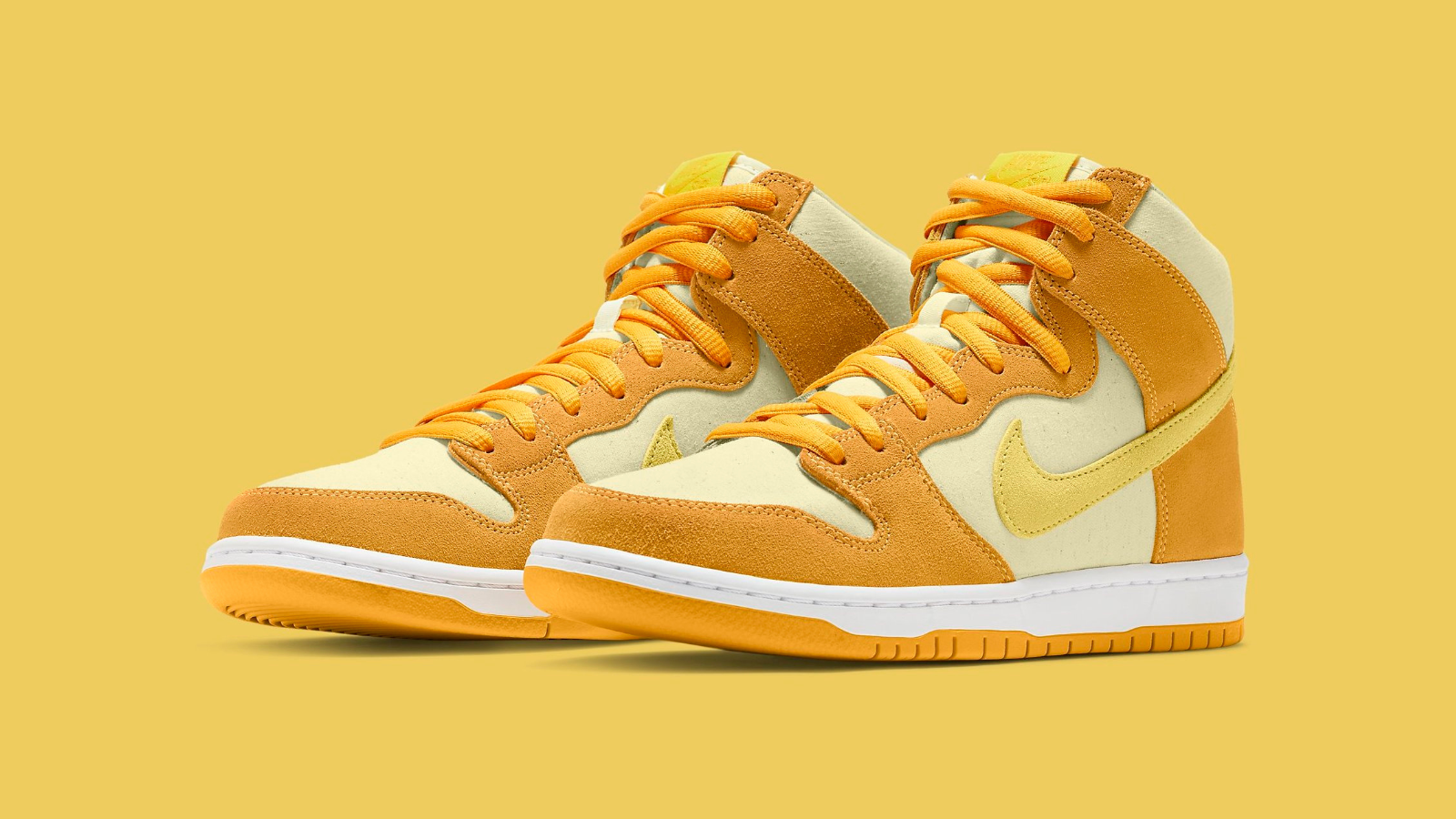 Following the Blue Raspberry, Pineapple is the only high variation of Dunk's Fruity Pack. Dressed in varying shades of gold and yellow, the sneaker steers clear from its counterpart's leather construction, instead opting for a pairing of textile underlays and suede overlays. Finally, custom pineapple logos adorn the inside tongue tags of the shoe.