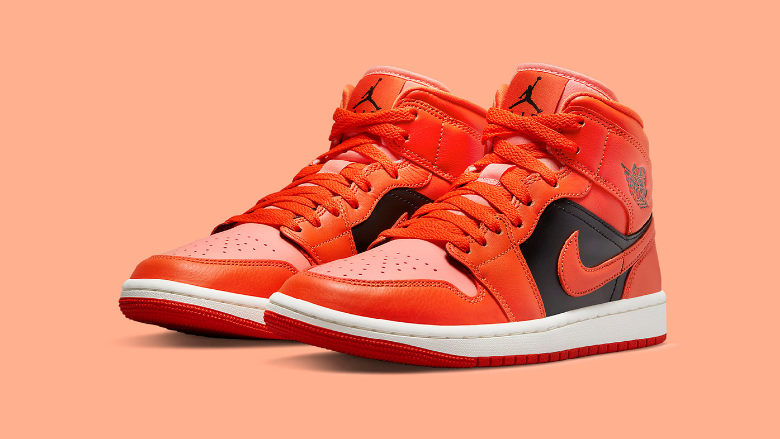 Reminiscent of Jumpman's Shattered Backboard, the Jordan 1 Mid Orange Black brings a vibrant shock to June's lineup. With orange overlays and collars, and jet black mid panels and motif branding, the sneaker also features piercing white midfoot panels and sherbet hued toe boxes and tongues.